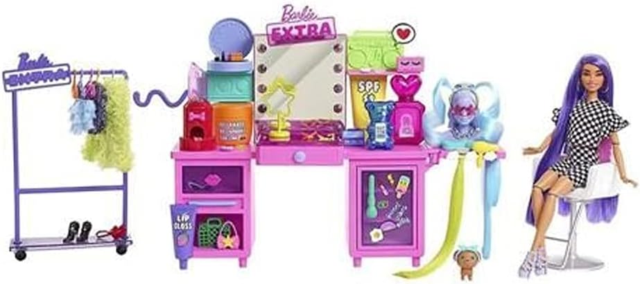 Pump up the style in this vanity-inspired playset with a working mirror and lights! It’s the perfect space to bring EXTRA-ordinary looks to life. Tell endless fashion stories with more than 45 pieces — an exclusive Barbie Extra doll, rolling clothing rack, fashions, accessories, hair extensions, adorable pup and more! After Barbie Extra doll is dressed and accessorized, check out her style in the vanity mirror, display fashions on the branded Barbie Extra hangers and rolling clothing rack or use the mannequin head for hair and accessory styling. There’s even a lipstick-shaped vending machine that dispenses puppy treats! The playset doubles as storage with working drawers, shelving and tons of fun-shaped accessory spaces, like a perfume bottle and lip gloss swatch accessory holder! The posable Barbie doll has extra-long purple hair and is wearing a trendy checkered outfit and neon furry coat — bringing those extra vibes wherever she goes. From bright and bold to fun and fierce, kids can mix and match to create looks that express their own unique style. Unleash their inner trendsetter with this playset while they imagine their bedroom is a runway or the stage of a show! Doll cannot stand alone. Colors and decorations may vary.