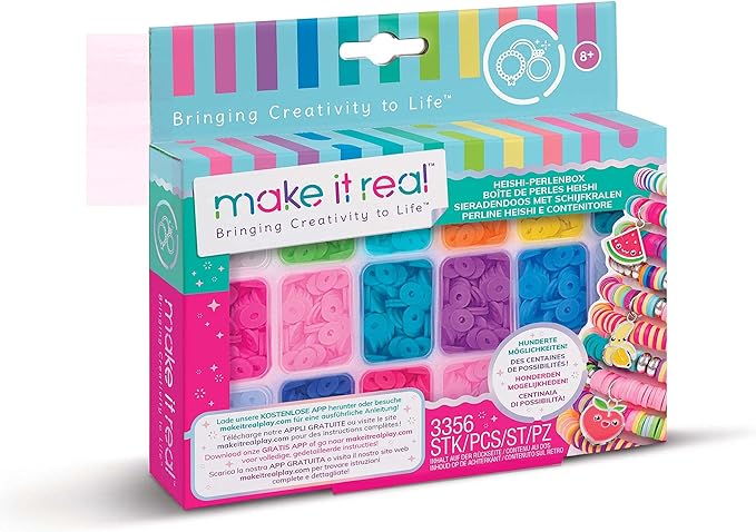 Pack contains 3,200 heishi beads, 150 silver beads, 3 charms, 1 elastic cord (4 m), 1 storage case, and instructions.