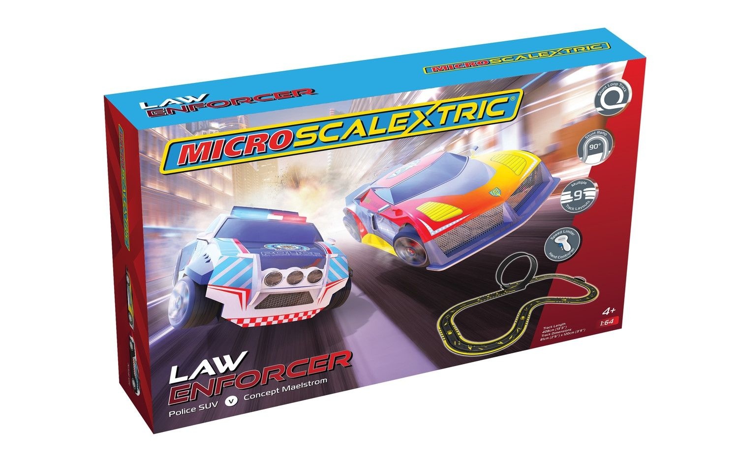 This set offers a compact size without compromising the thrill of full-sized slot car racing.
